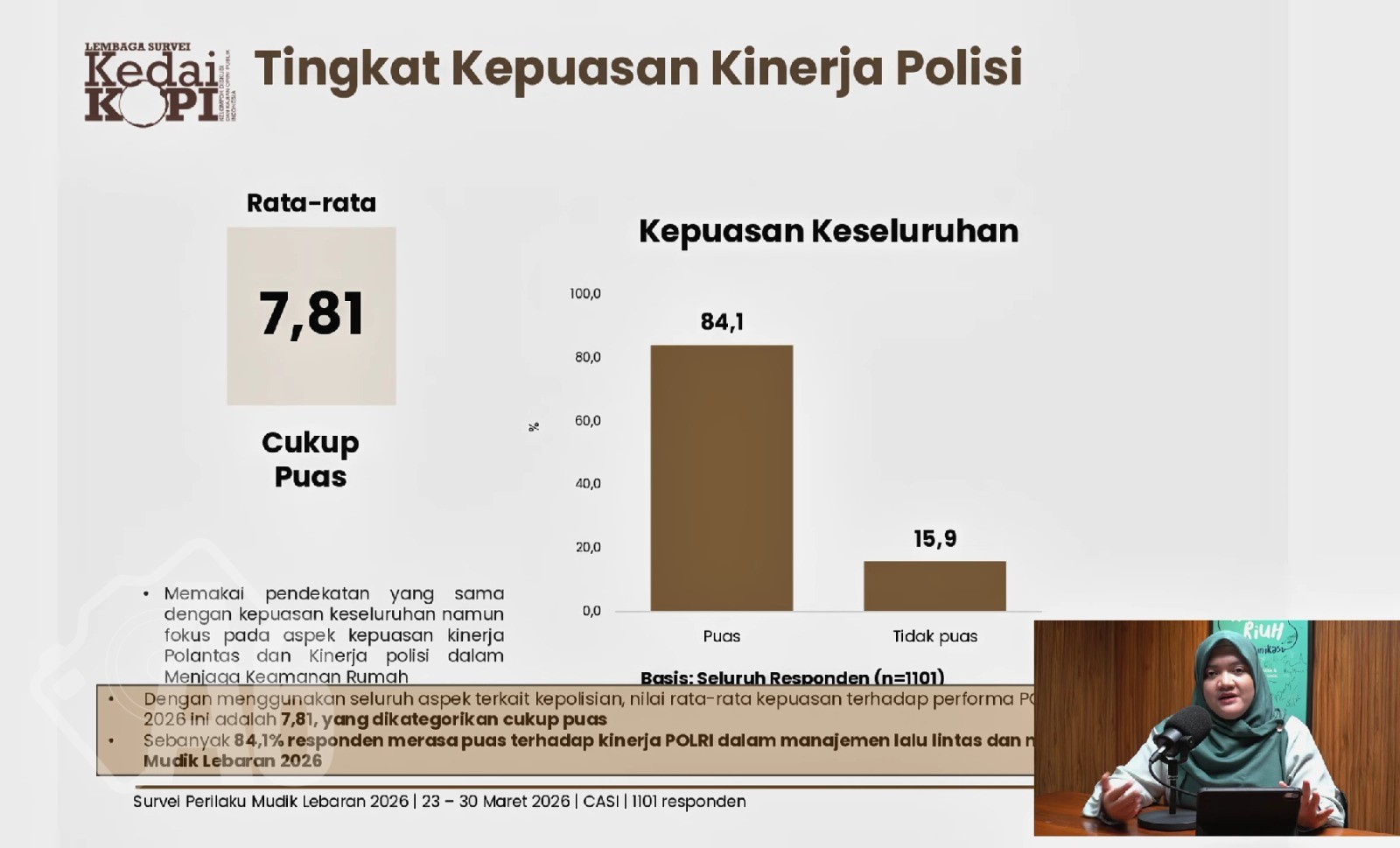 Hasil itu disampaikan oleh Head of Research KedaiKOPI, Ashma Nur Afifah, dalam pemaparan survei tahunan KedaiKOPI terkait pelaksanaan mudik Lebaran, Senin (6/4/2026). Survei dilakukan pada 23–30 Maret 2026 terhadap 1.101 responden yang memenuhi kriteria sebagai pemudik Lebaran 2026.