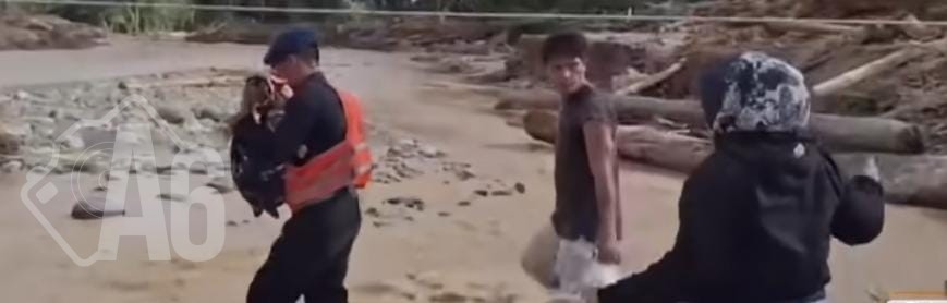 Dalam sebuah insiden dramatis di Kecamatan Batang Toru, Tapanuli Selatan, seorang anggota Brimob terlihat menggendong seorang bayi menyeberangi jembatan darurat yang hampir roboh diterpa derasnya arus sungai pascabanjir.