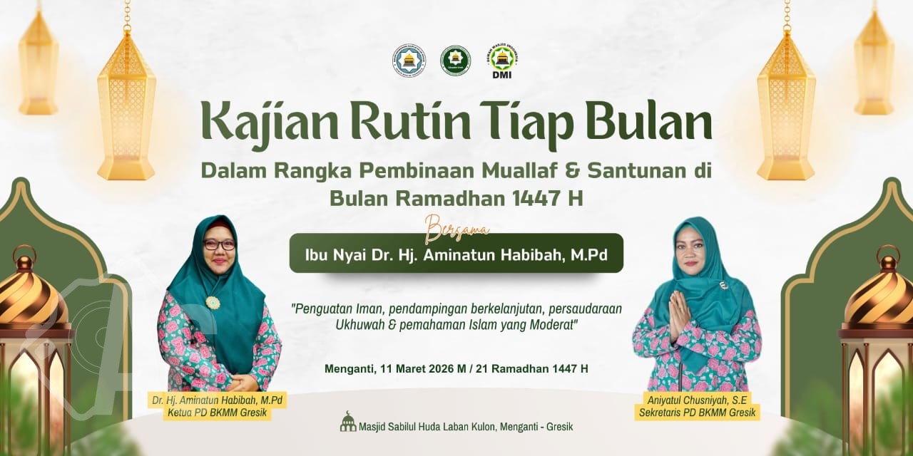 Pimpinan daerah badan koordinasi majelis taklim masjid ( PD BKMM) Gresik , bersama pimpinan cabang badan koordinasi majelis taklim masjid ( PC BKMM ) kecamatan Menganti, menggelar kajian rutin tiap bulan dalam rangka pembinaan muallaf dan santunan, bulan Ramadhan 1447 H, Rabu 11 Maret 2026 bertempat di masjid Sabilul Huda , Laban Kulon kecamatan Menganti kabupaten Gresik.