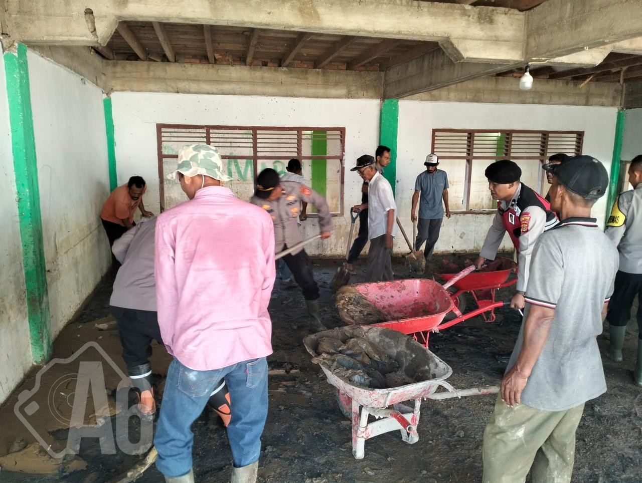 Kegiatan difokuskan pada pembersihan lumpur sisa luapan banjir di area parkir, halaman mesjid, serta lingkungan sekolah agar dapat segera digunakan kembali untuk kegiatan belajar dan ibadah.