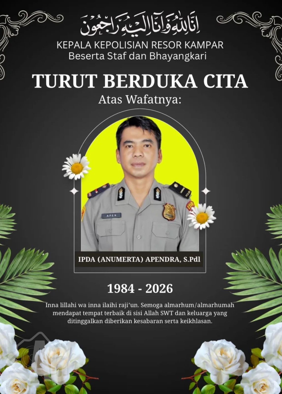 Aiptu Apendra, yang menjabat sebagai Banit Reskrim Polsek Kampar, dinyatakan meninggal dunia pada Sabtu (21/03) sekitar pukul 02.39 WIB, akibat kelelahan dan sesak napas saat bertugas.