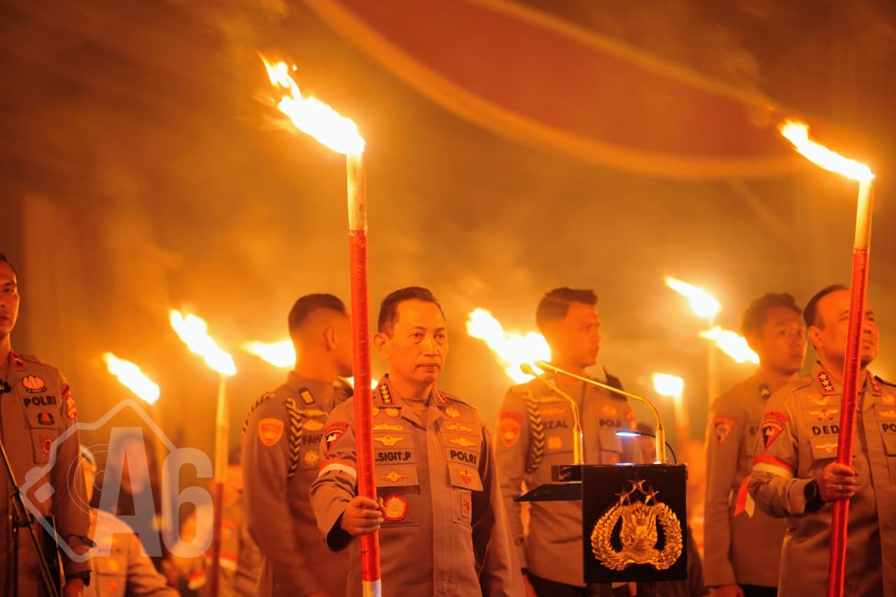 Renungan yang berlangsung dalam suasana gelap dan diterangi ribuan obor itu diikuti oleh Pejabat Utama (PJU) Mabes Polri, para Kapolda, para Karo Ops, serta Kapolres dari seluruh Indonesia, total lebih dari 600 peserta sesuai susunan formasi resmi kegiatan.