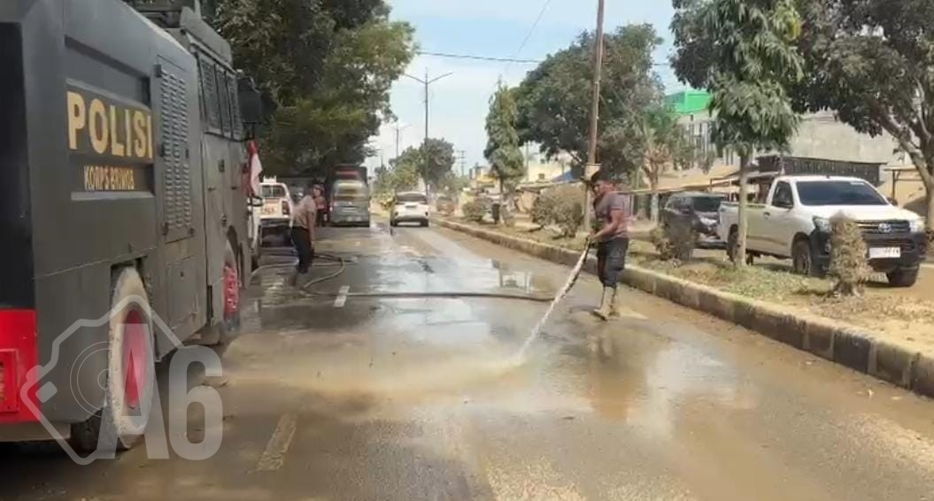 Menyikapi kondisi tersebut, Polri melaksanakan pembersihan serta penyiraman jalan protokol di Kabupaten Aceh Tamiang, Kamis (25/12).