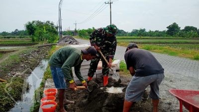 Babinsa Koramil 0817/03 Kedamean Bersama Warga Laksanakan Karya Bakti Pembuatan Plengsengan di Desa Glindah